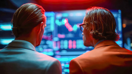 Rear view of two young guys looking at computer screens with stock market data. Stock market trading concept