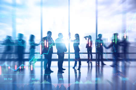 Colleagues and trade concept. Group of successful businesspeople standing in blurry office interior with forex chart. Double exposure