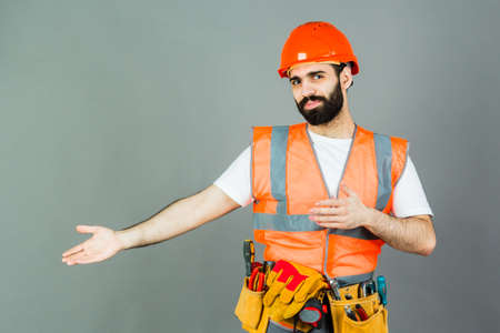 Construction Worker Holding Constructing Equipment Tools on Isolated Background. Carpenter Man Builder Real Estate Jobs Occupation, Business Engineering Industry and Building Development Concept.