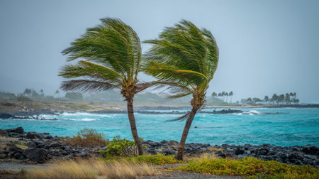 Two palm trees are featured in a coastal setting during a windy day. The scene showcases the turbulent water and the strong wind blowing through the palm trees, providing an image of a beautiful yet powerful nature scene.