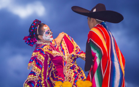 COACHELLA , CALIFORNIA - NOV 01 : Traditional Mexican dancers perform at the Dia De Los Muertos celebration in Coachella , California on November 01 2014