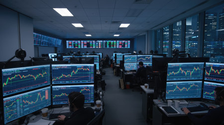 An interior shot showcases a modern trading room filled with computer screens displaying financial data. The scene presents a cool-toned palette with artificial lighting and the glow of screens dominating the space. Possible uses for this image include financial news stories or illustrations for economic articles, both print and digital.
