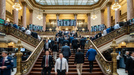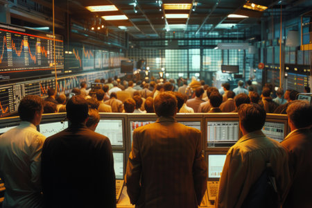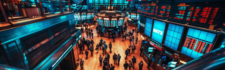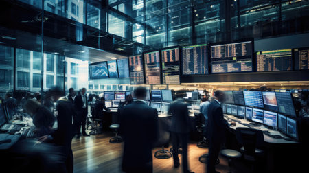 Inside a bustling stock exchange with traders active at work during a busy trading session in the late afternoon