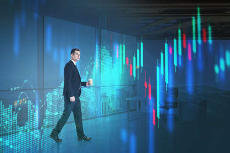 Businessman with stock market changes, walking in office room, business building. Young man in black suit with coffee. Concept of working in corporation