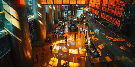 An aerial shot of a busy trading floor with people working in an office filled with computers, all looking at their screens. Generative Ai