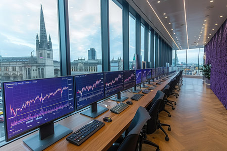 A modern financial office featuring large display screens with stock market trends and analytics, showcasing real-time data in a sleek and contemporary environment.