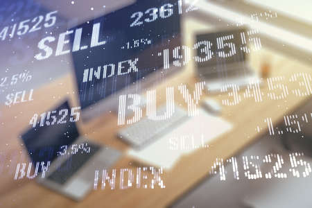Abstract creative financial graph and modern desktop with pc on background, financial and trading concept. Multiexposure