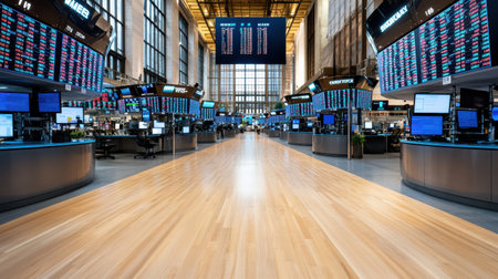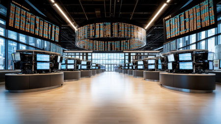 A modern stock exchange trading floor with digital displays and monitors