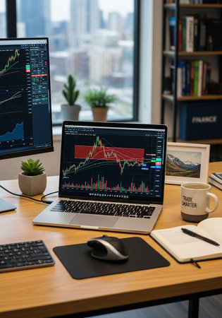 Stock Market Analysis on Laptop with Financial Chart Display in Modern Office
