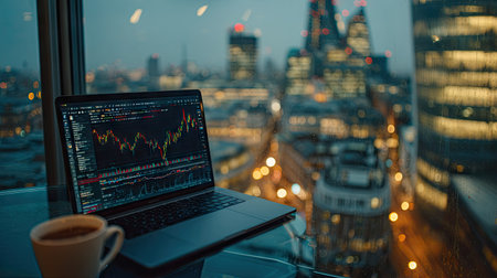 A laptop screen showcases financial data, resting near a window overlooking a cityscape. Soft lighting illuminates the scene, featuring blurred city lights. The composition suggests business and analysis, suitable for commercial use. The color palette incorporates dark tones, creating a modern atmosphere for financial concepts.