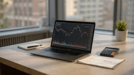 A bright trading setup with economic indicator charts on a laptop, organized documents, and a mug of coffee.