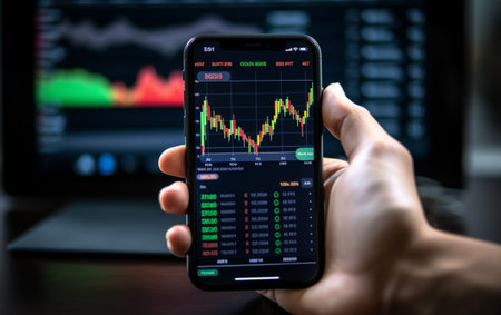 Investor's hand interacts with a stock trading app on a smartphone amidst a blurred office backdrop, emphasizing financial analysis and decision-making. the image highlights the convergence of technology and finance in a professional environment.