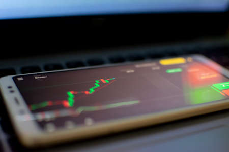 Crypto data chart at smartphone. Online trading is an activity of buying and selling shares with the aim of making a profit from the difference between the initial purchase price and the selling price