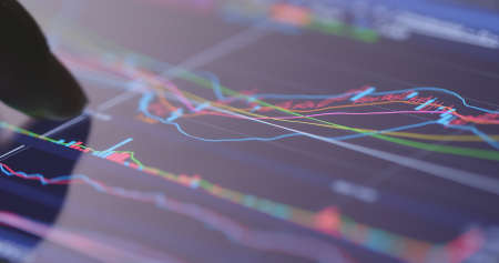Follow stock prices, stock quotes and the rise and fall of the cryptocurrency on a mobile tablet. The hand draws on the tablet screen using a stylus. close-up small depth of field