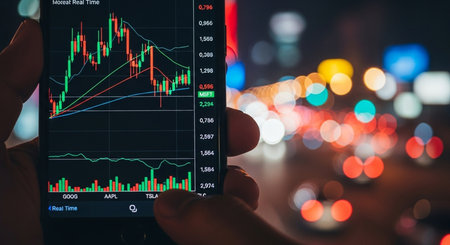 Investor's hand interacts with a stock trading app on a smartphone amidst a blurred office backdrop, emphasizing financial analysis and decision-making. the image highlights the convergence of technology and finance in a professional environment.