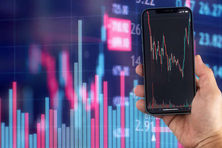 Male hand holding a smartphone with financial stock market graph. Stock Exchange. Graphics in the background.