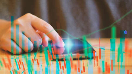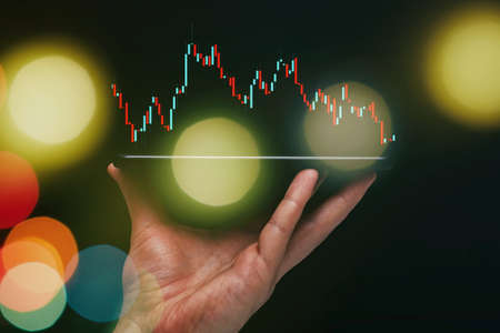 Stock market graph for tranding and investment in security exchange. Woman holding phone Show the stock index screen. Stock market investment concept Accounting Finance.
