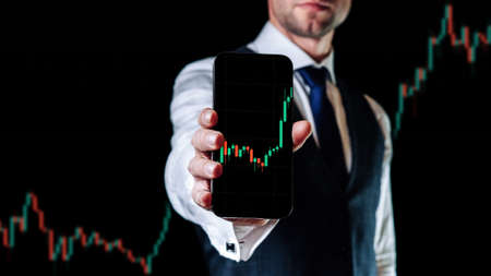 Stock market investment app in hand. Telephone with a stock chart. Screen close-up