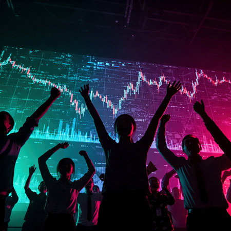 Diverse business team celebrating financial gains, watching a stock market graph on a large screen, illuminated with vibrant colors. Success, teamwork, and achievement captured.