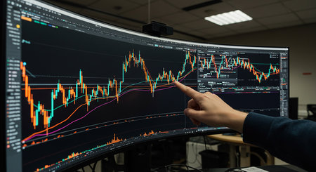 A person points at a stock market chart displayed on a large curved monitor, indicating analysis of financial trends and investment strategies.