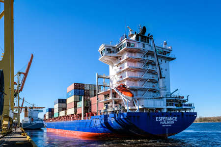 Riga, Latvia - April 20, 2022: Baltic Container Terminal in Freeport of Riga. Riga harbour, Latvia. Container ships in a port. Defocused