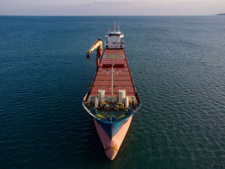 Large general cargo ship tanker bulk carrier, Top down aerial view at sunset.
