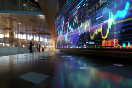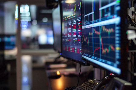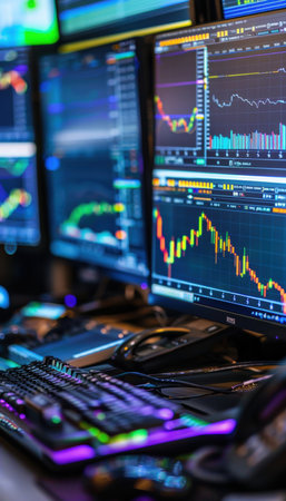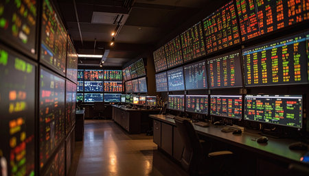 Modern financial trading room featuring multiple monitors presenting real time market charts and data