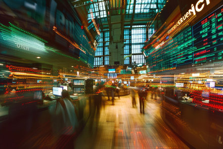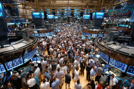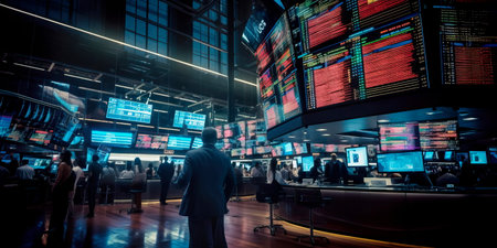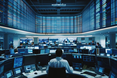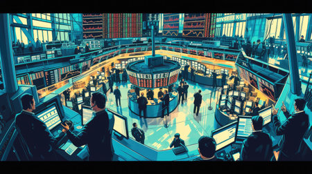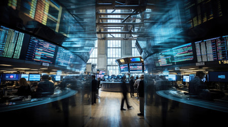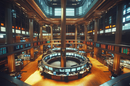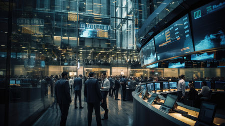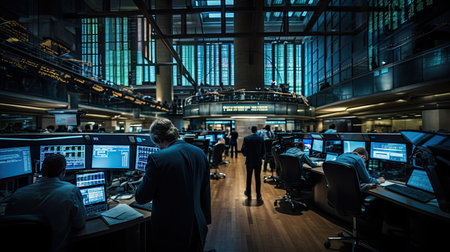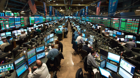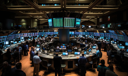 Traders analyze market trends and monitor stock prices in a busy financial exchange during trading hours