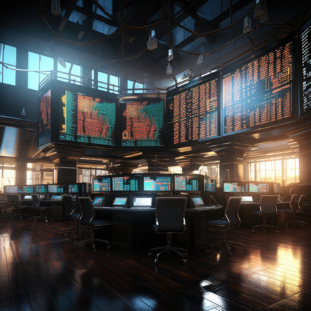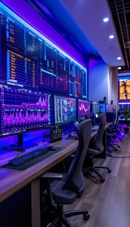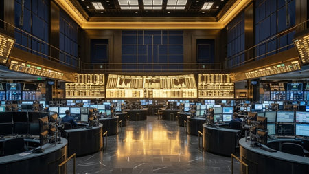 The image depicts a modern financial trading room equipped with numerous computer screens and workstations. The room features a sleek, high-tech design with large windows allowing natural light to enter. The space is organized with multiple desks, each equipped with multiple monitors displaying financial data. The overall ambiance is professional and focused, emphasizing efficiency and technological advancement.