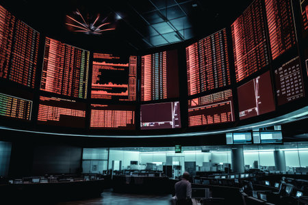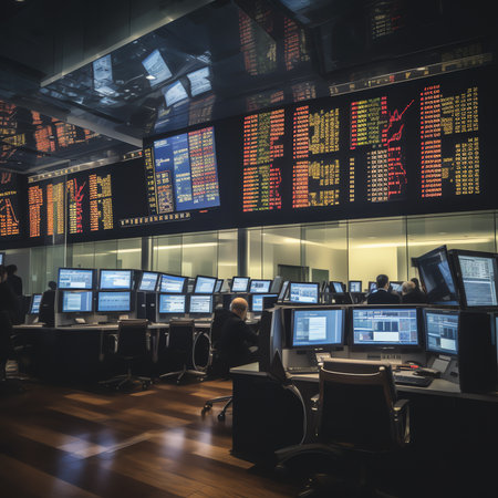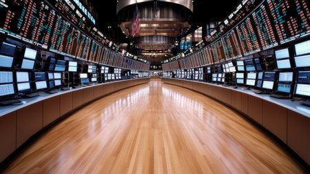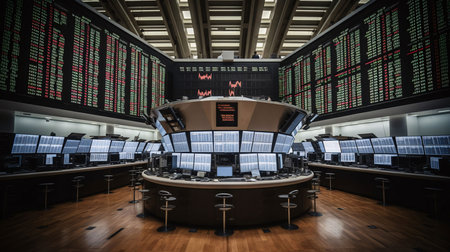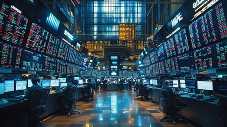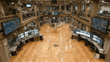 Modern stock exchange floor featuring multiple screens and advanced trading technology.