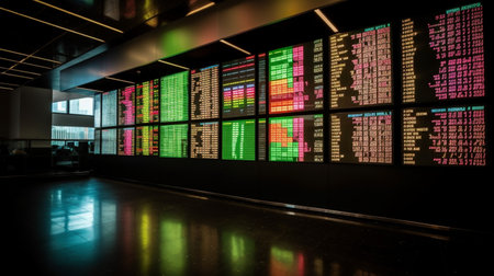 Wall of LED screens displaying corrupted stock tickers with digital artifacts, eerie green glow in dark room.