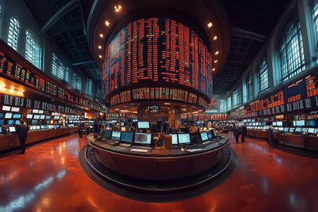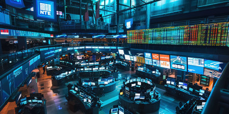 Panoramic view of a busy stock exchange floor with multiple trading screens and traders, showcasing financial market activity