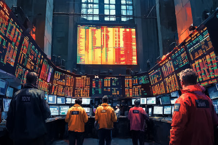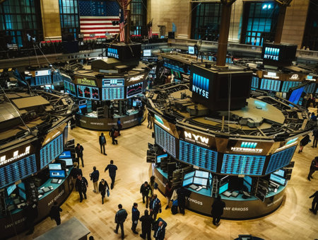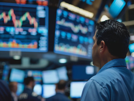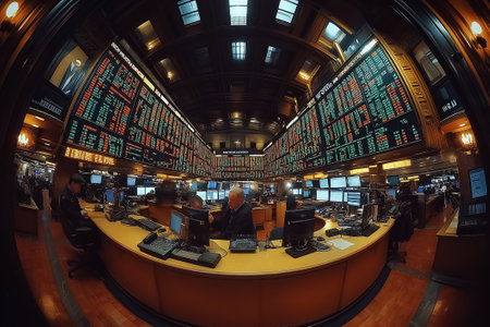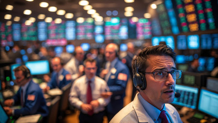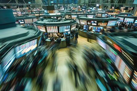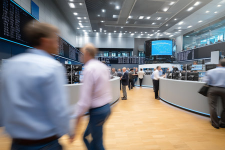Trading floor activity shows brokers analyzing stock market trends during a busy trading session in the financial district