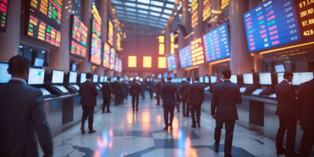 Dynamic scene of traders and investors on a busy stock exchange floor with digital displays