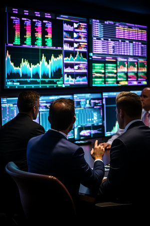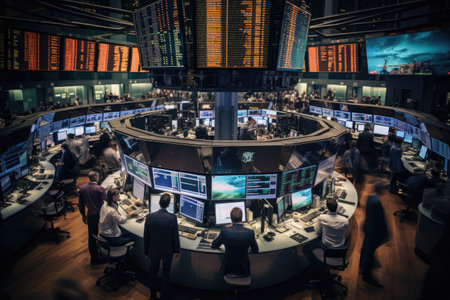 The room is bustling with activity as numerous computer monitors display various data and information. Traders are seen closely monitoring the screens, making decisions based on the real-time data.