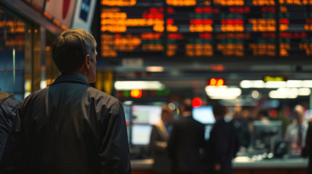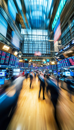bustling stock exchange floor with traders and digital displays showing global market trends.