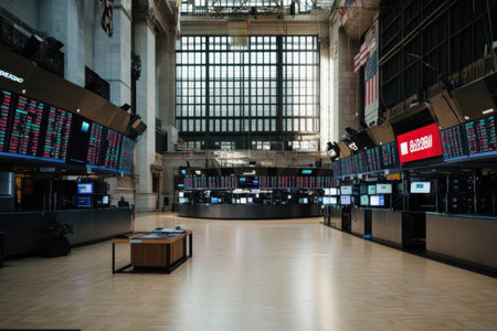 The stock exchange floor is completely empty, highlighting rows of trading screens and monitors around a spacious area. Natural light streams through large windows, emphasizing the stark atmosphere.