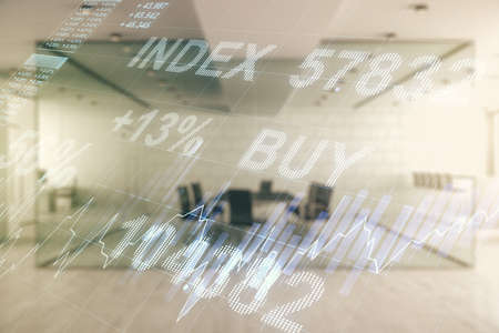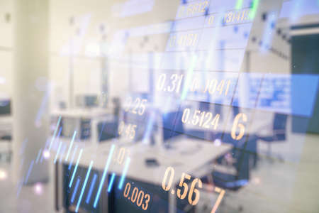 Multi exposure of virtual abstract financial graph interface on a modern furnished classroom background, financial and trading concept