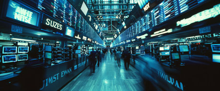 Blurred action of traders on a bustling stock exchange trading floor with extensive digital displays and screens