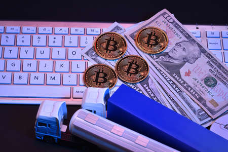 Bitcoin cryptocurrency mining and transport concept. Blockchain technology. Toy truck with golden bitcoins and other currency. Dark background