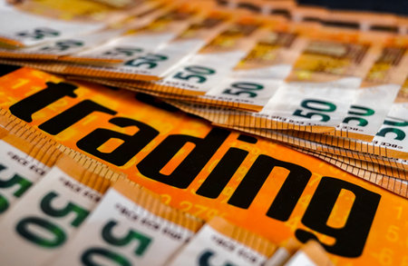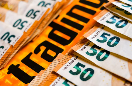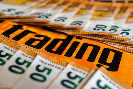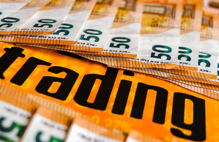 Close-up of the word TRADING printed on the background of 50 Euro banknotes.
