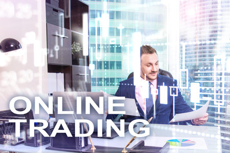 Online trading, FOREX, Investment concept on blurred business center background.