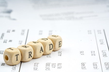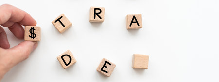 Word trade. Wooden small cubes with letters isolated on white background with copy space available.Business Concept image.