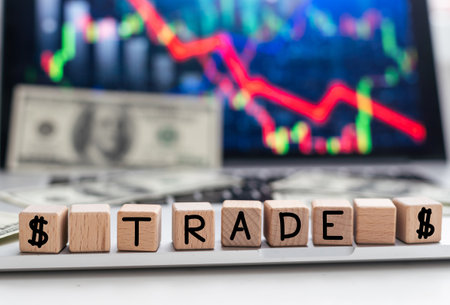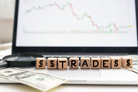 On the laptop, on wooden cubes near the pen, the word TRADE is written.