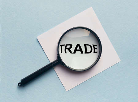 TRADE word on paper through magnifying glass on blue table. white and black colors