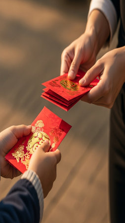 A dramatic, vertical close-up of hands exchanging traditional red envelopes (Hongbao) between an adu