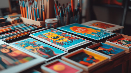 A close-up captures an artist's table filled with colorful paintings, brushes, and art supplies. The scene exudes creativity, with a warm, inviting atmosphere.