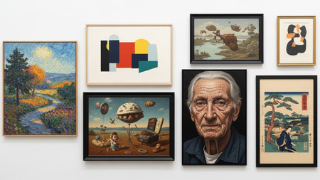 A gallery wall showcasing a variety of framed artworks, from a vibrant impressionist landscape to a detailed...