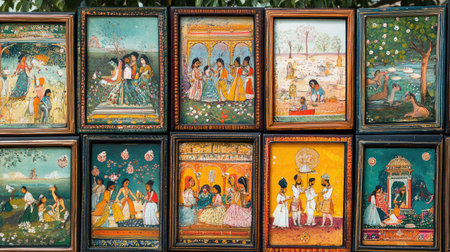 A collection of colorful Indian miniature paintings displayed in natural sunlight.