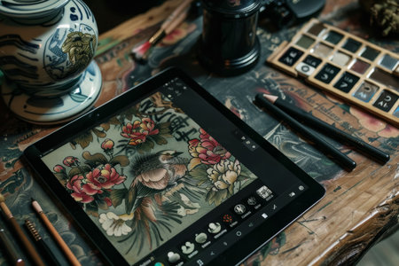 A digital tablet screen presents a meticulously crafted tattoo design, surrounded by traditional art supplies, evoking a fusion of ancient artistry and modern technology